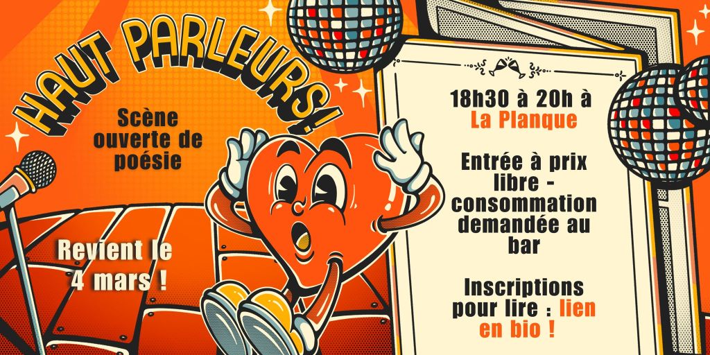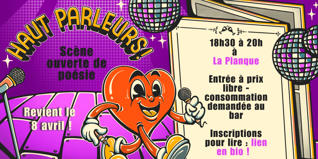 Toutes les voix et styles d’écriture sont les bienvenues aux scènes ouvertes. Pour lire, il faut s’inscrire environ deux semaines avant le jour J sur le formulaire ci-dessous. Pour connaître la date exacte de mise-en-ligne du formulaire, abonne-toi à la Newsletter, ou suis-nous sur Instagram.